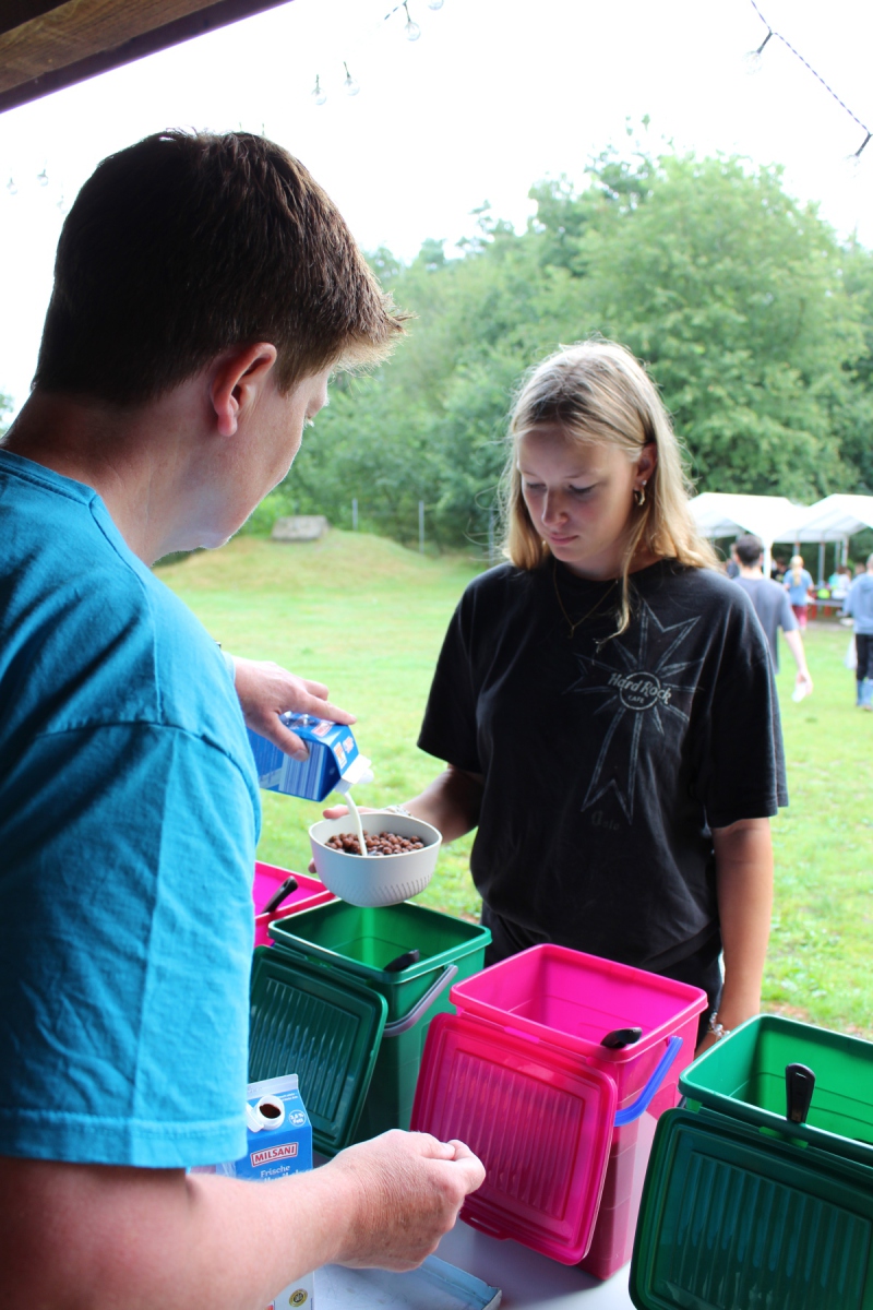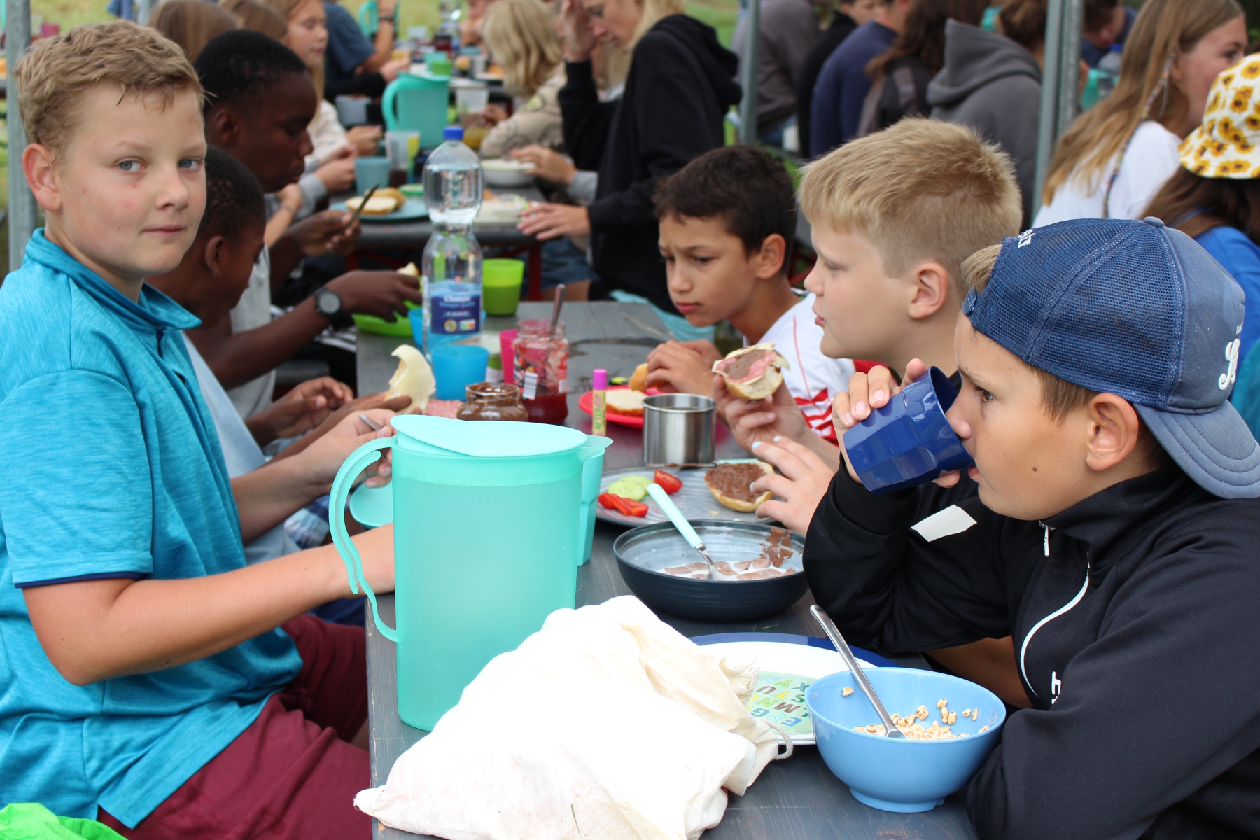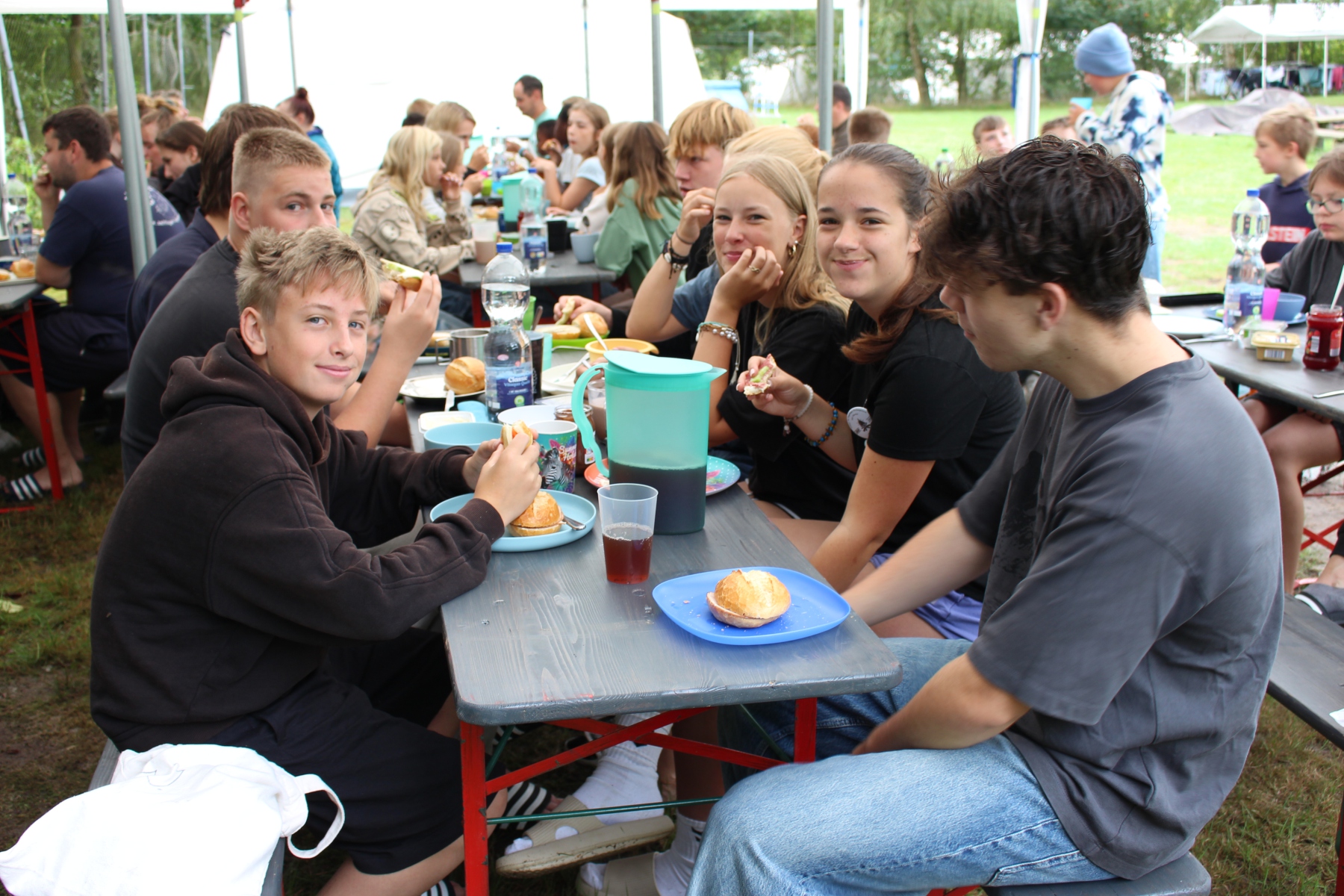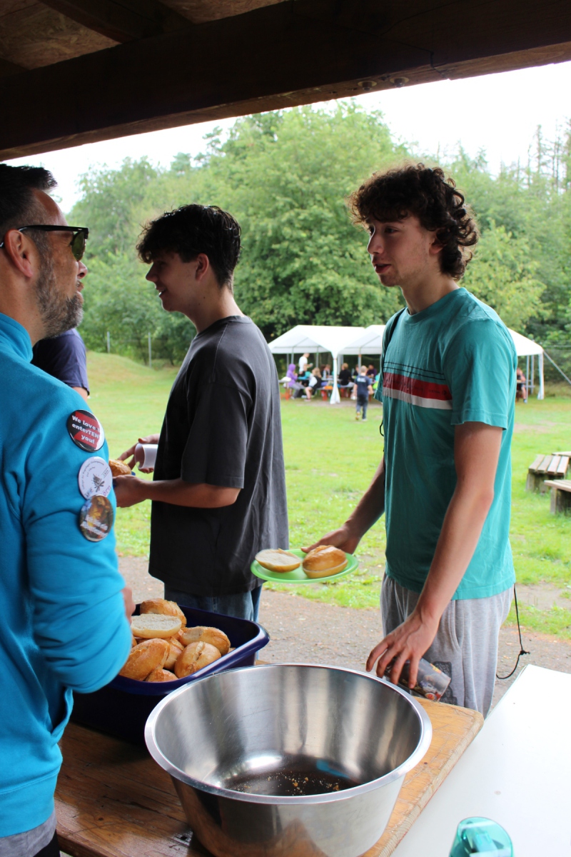 Um 9:15 Uhr gab es das erste Frühstück in diesem Zeltlager. Jeder konnte sich aussuchen, ob er Brötchen mit Wurst, Käse, Marmelade, Frischkäse oder Nuss Nougat Creme oder Cornflakes mit Milch essen wollte.