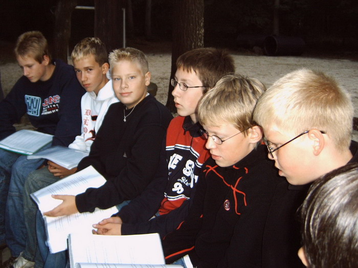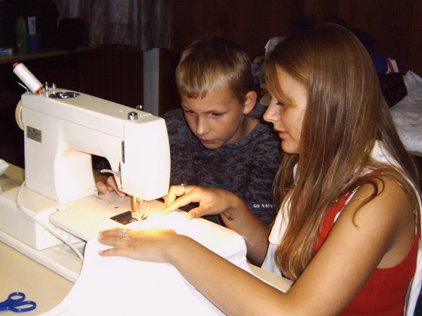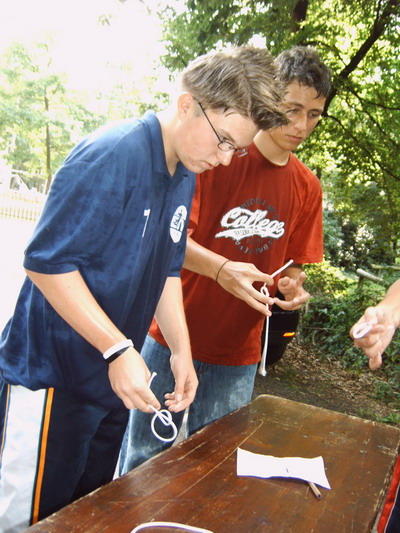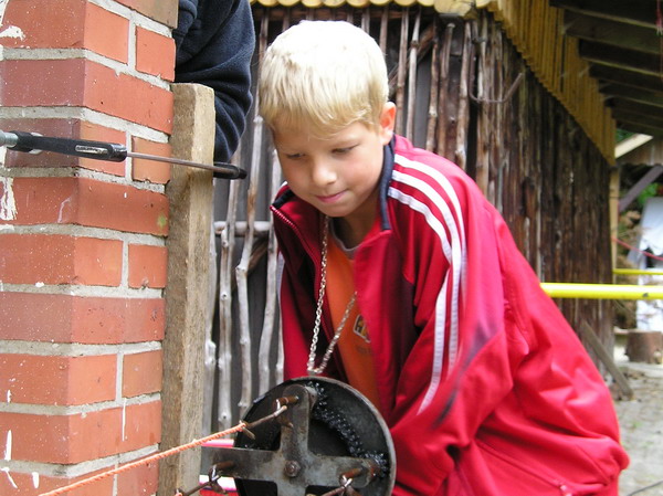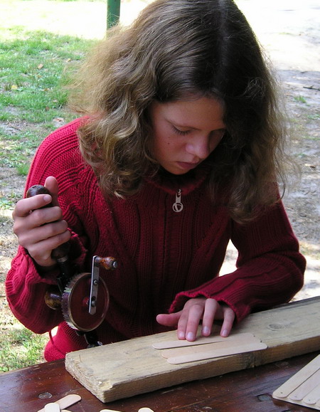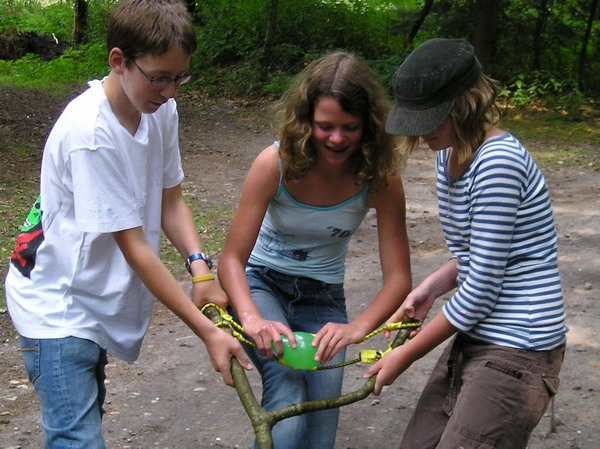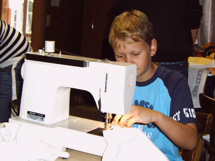 Paddy dreht Seile für den Seilgarten, Nils und Patrick nähen ein Piratentuch und Annika baut eine Schatzkiste.