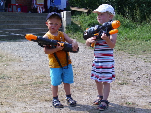 Die Kinder lieferten sich Wasserschlachten mit eiskaltem Wasser aus den Wasserpistolen.