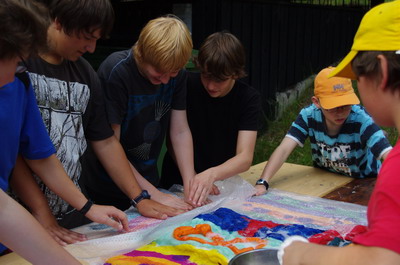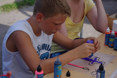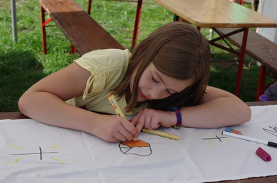 Die Alltardecke wurde gebatikt, Tischläufer wurden bemalt, die Kerzen und die dazugehörigen Gläser verziert,
