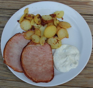 Zum Mittagessen gab es Kasseler mit Bratkartoffeln und Remoulade.