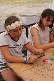 Es wurden Schlüsselanhänger und Armbänder geknotet, Accessoires für die Fotobox am Abend gebalstelt,